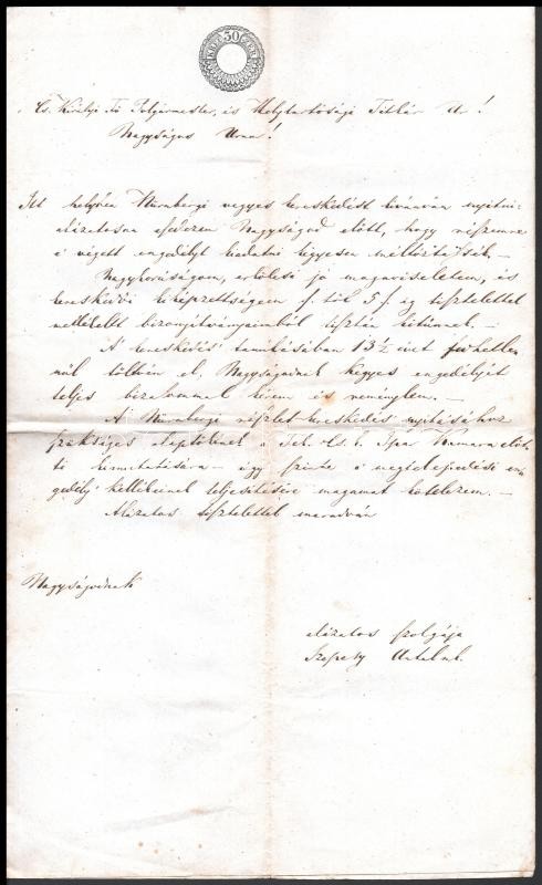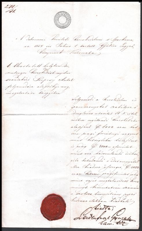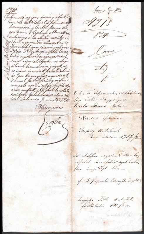1854 Szepesy Antal debreceni kereskedő kérelme nürnbergi típusú vegyeskereskedés nyitására a Piac utcában, hátoldalán Csorba János tanácsnok, debreceni polgármester által saját kézzel aláírt engedélyező véleménnyel, hozzátartozik a Debreceni kerületi Kereskedelmi és Iparkamara szintén támogató okmánya, Leidenfrost Gyula kamarai titkár saját kezű aláírásával és a kamara viaszpecsétjével, mindkét okmányon 30 kr illetékbélyeggel, jó állapotban