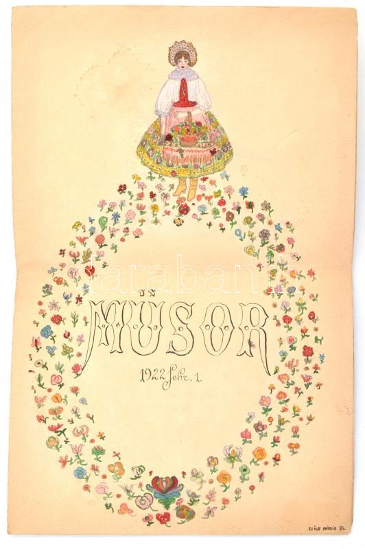 Description: 1922 Bp., A várbeli leánygimnázium [M.kir. Állami Szilágyi Erzsébet Leánygimnázium (ma: Szilágyi Erzsébet Gimnázium] 1922. feb. 1.-én a Várszínházban tartott előadásának műsora, kézzel rajzolt, festett címlappal, hajtásnyommal, folttal, 29x20 cm