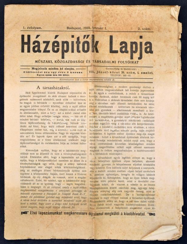 1910 Házépítők Lapja. I. évf. 2. sz., 1910. feb. 1. Szerk.: Dr. Lukács...