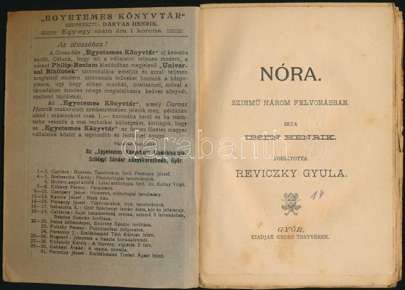 Ibsen Henrik: Nóra. SzÃnmű három felvonásban. FordÃtotta: Reviczky Gyula. Egyetemes Könyvtár. 59-61. sz. GyÅ‘r,é.n.(cca 1890),Gross Gusztáv és Testvérek, 112 p. Kiadói papÃrkötés, kijáró lapokkal, kissé dohos.