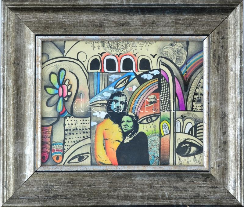 Farkas 77 jelzéssel: Ketten. Vegyes technika, papír. 17x23 cm Üvegezett keretben.