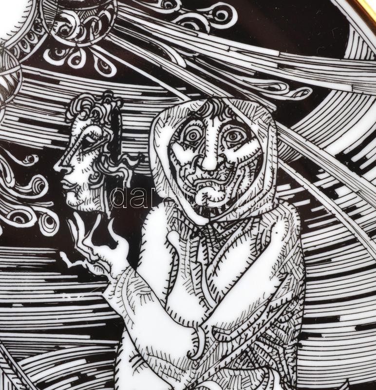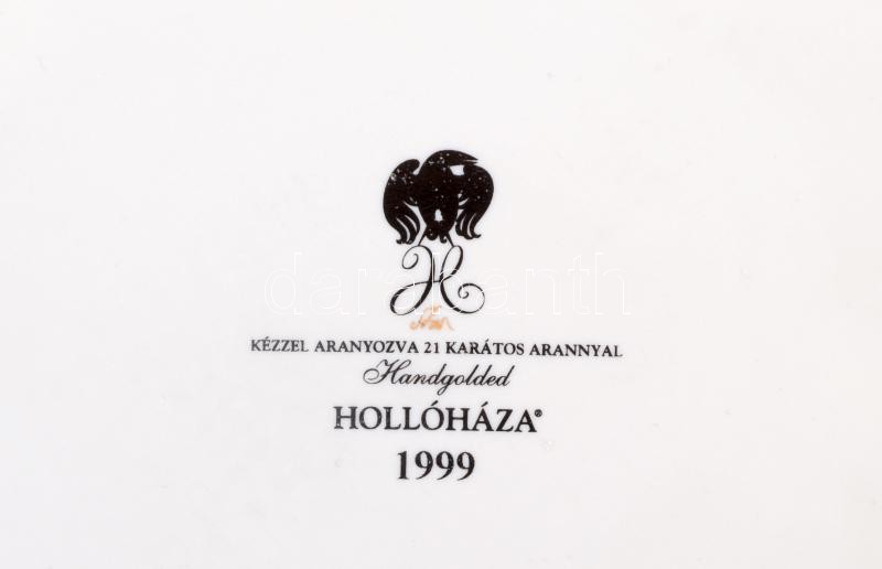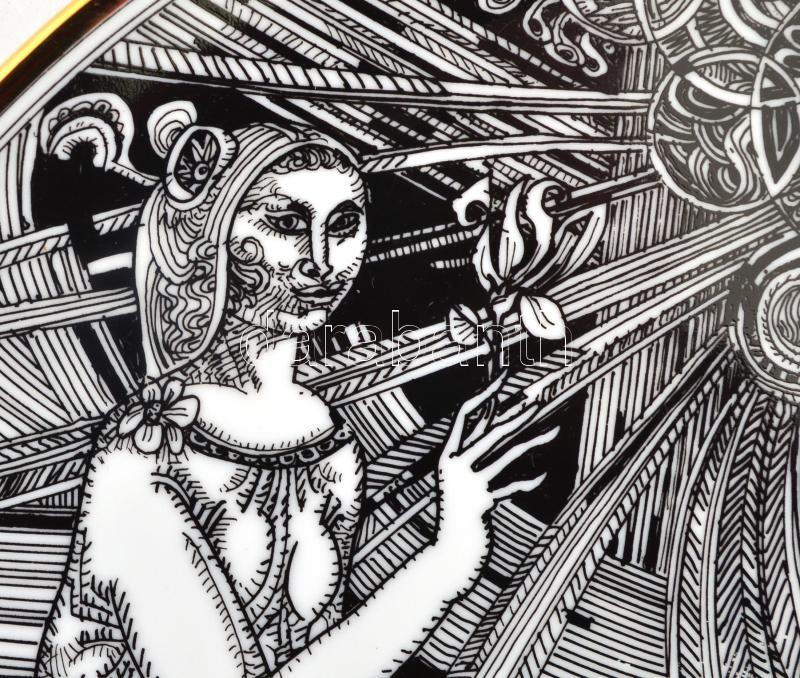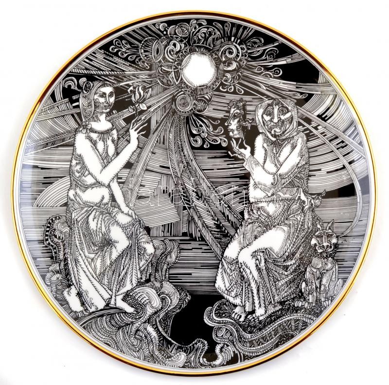 Description: Szász Endre által tervezett Hollóházi porcelán dísztányér, 24 karátos kézi aranyozással, jelzett, apró kopásokkal /
