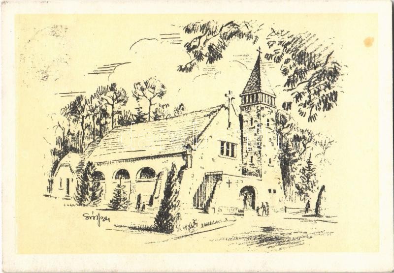 1935 Balatonfenyves, Építés alatt álló Szent Erzsébet római katolikus templom távlati képe s: Soós István