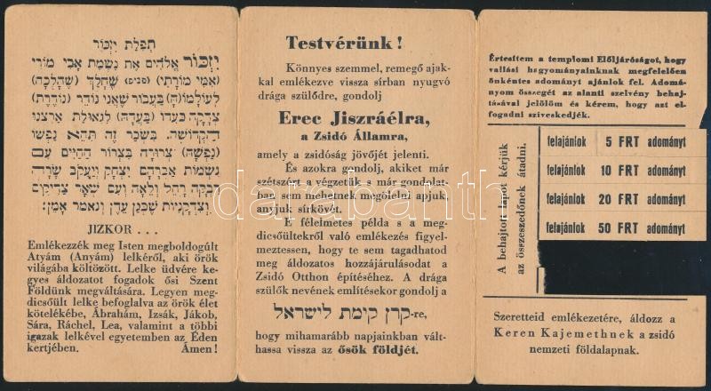 Jizkor-ima, kis füzetke, 2 db kivágott adományszelvénykével