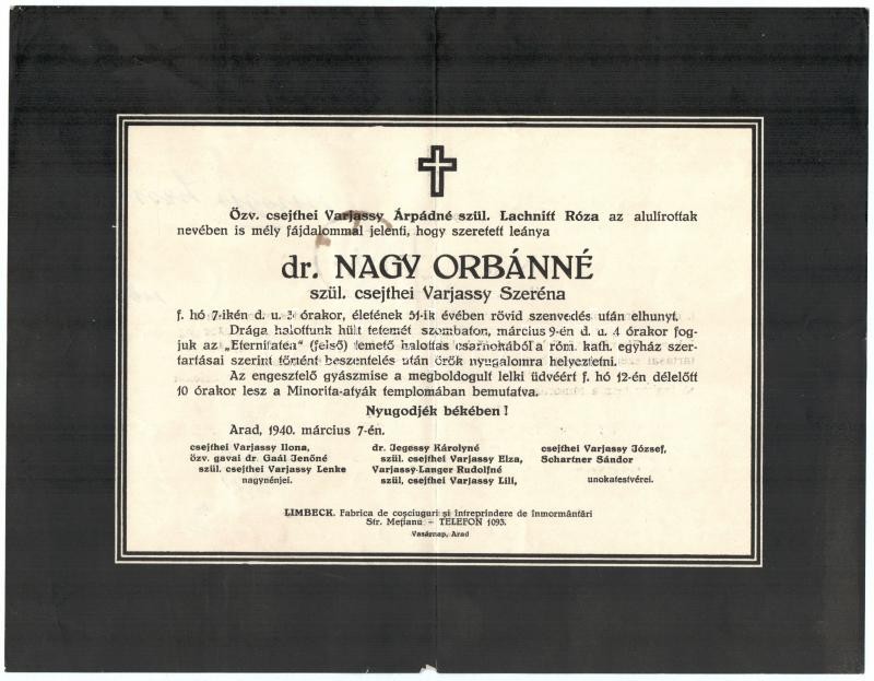 1940 Arad, dr. Nagy Orbánné csejthei Varjassy Szeréna halálozási értesítője, a rokonság között a csejthei Varjassy család tagjaival.