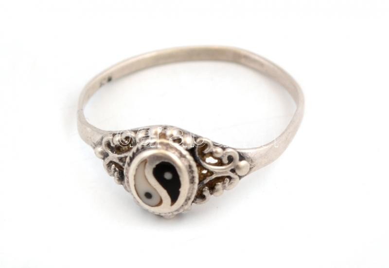 Ezüst(Ag) gyűrű, Yin Yang jellel, jelzett, deformációval, méret: 58, bruttó: 1,4 g