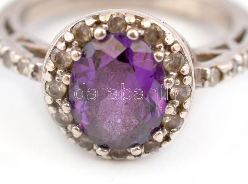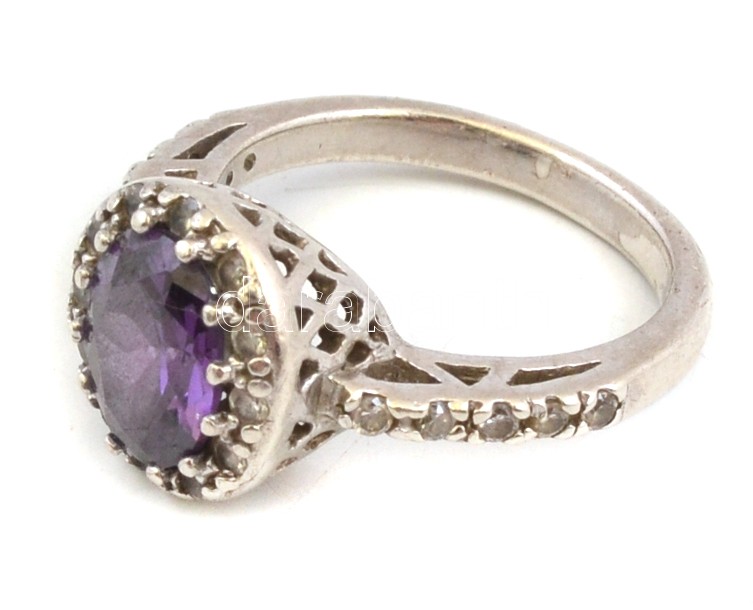Ezüst(Ag) gyűrű, lila kővel, jelzett, méret: 59, bruttó: 6,5 g