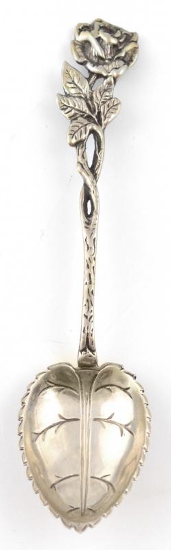 Ezüst(Ag) rózsás leveles kanál, jelzett, h: 11 cm, nettó: 10,7 g