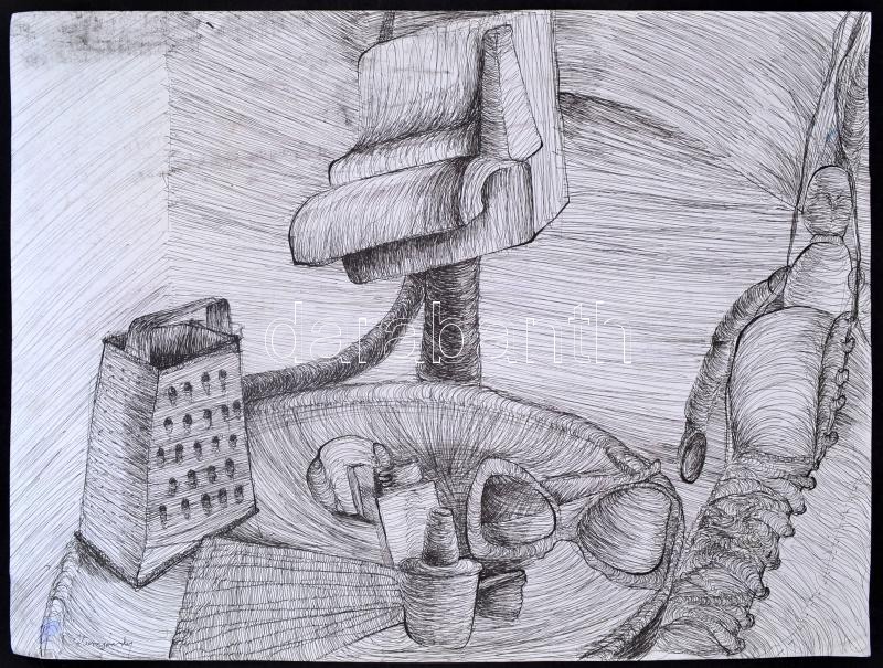 Olvashatatlan jelzéssel: Kompozíció sajtreszelővel. Tus, papír, 45×59,...