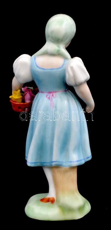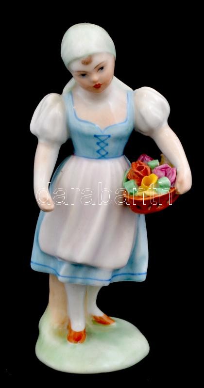 Herendi virágkosaras lány, kézzel festett, jelzett, hibátlan, m: 14,5 cm