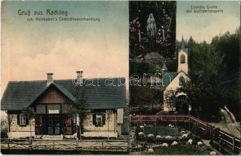 1918 Rachling, Joh. Reinbacher's Gemischtwarenhnadlung, Lourdes Grotte mit Wallfahrtskapelle / shop, chapel