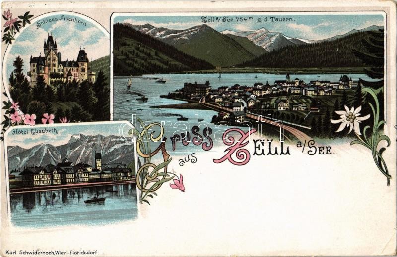Description: Zell am See, Schloss Fischhorn, Hotel Elisabeth, Zell a. See gegen d. Tauern / castle, hotel, general view with mountains. Karl Schwidernoch Art Nouveau, floral, litho (EK)