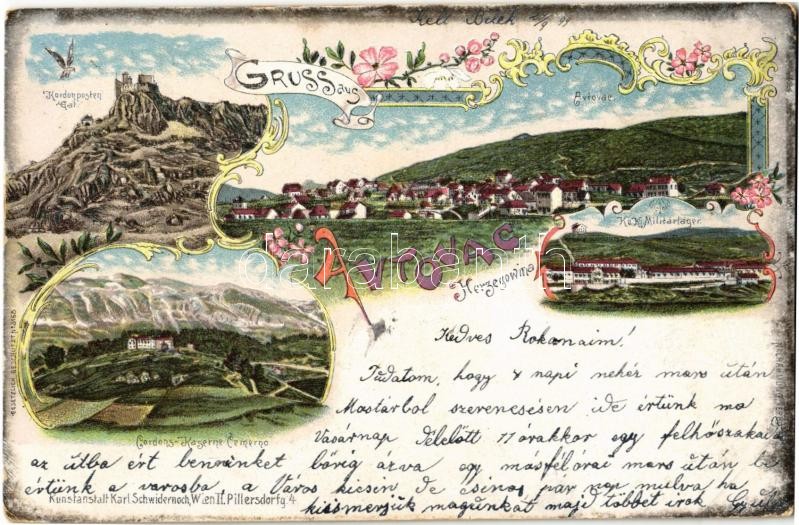 Avtovac, Kordonposten Gat, K.u.K. Militärlager, Cordons-Kaserne Cemerno / K.u.K. military barracks and cordon station. Kunstanstalt Karl Schwidernoch No. 3168. Art Nouveau, floral, litho (EK)