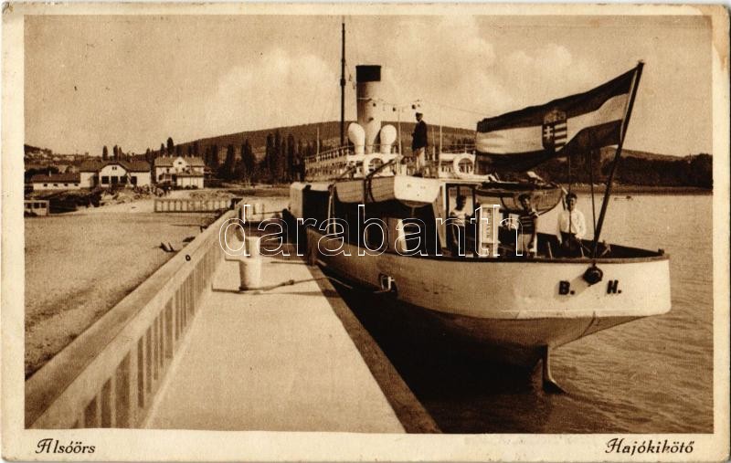 1933 Alsóörs, Hajókikötő, gőzhajó, kapitány és matrózok, címeres magyar zászló. Baracskay József kiadása