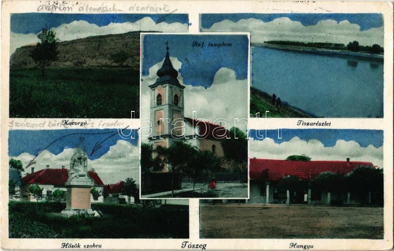 1938 Tószeg, Kucorgó (Laposhalom), Református templom, Tisza, Hősök szobra, emlékmű, Hangya Szövetkezet üzlete és saját kiadása