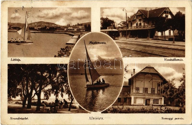 1939 Alsóörs, látkép, vitorlás, naplemente, Vasútállomás, vonat, strand, Somogyi pensio (EK)