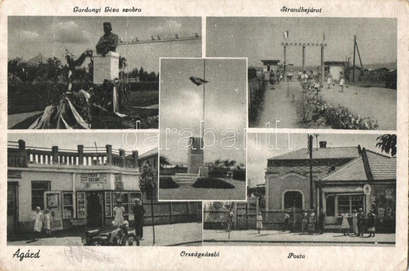 Agárd (Gárdony), Gárdonyi Géza szobor, Strand bejárat, Országzászló, Posta hivatal, Csajka bazár üzlete, motorkerékpár, motorbicikli. A Csajka bazár saját kiadása (Rb)