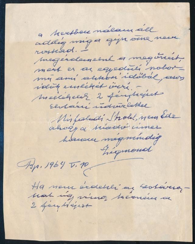 1969 Kisfaludy Stróbl Zsigmond szobrászművész 2 oldalas kézzel írt lev...