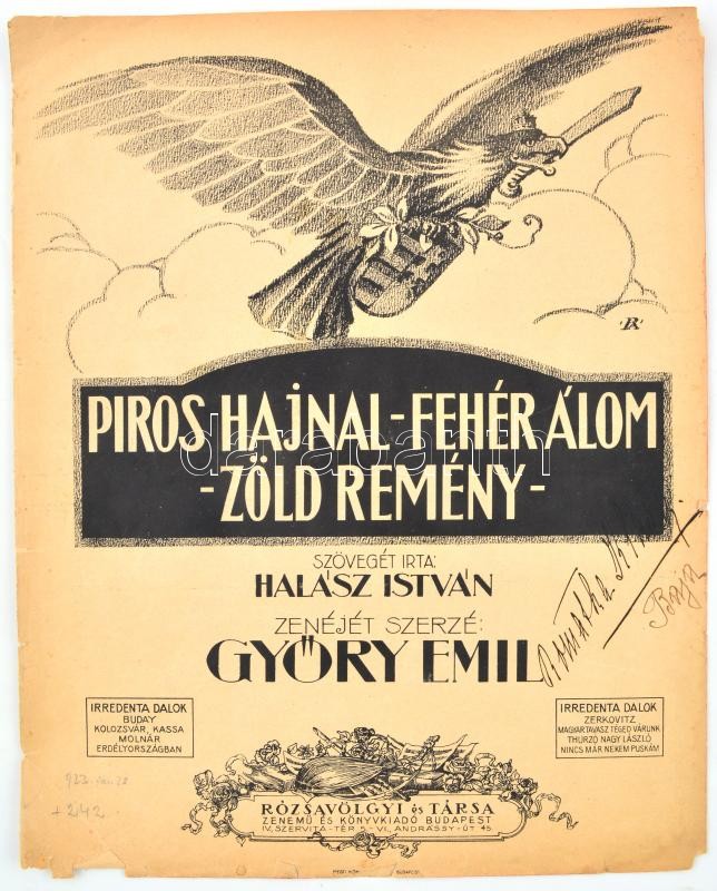 Halász István-Győry Emil: Piros hajnal-fehér álom-zöld remény. Irredenta kotta. Bp., én., Rózsavölgyi, kissé foltos, kis szakadással, 3 p.