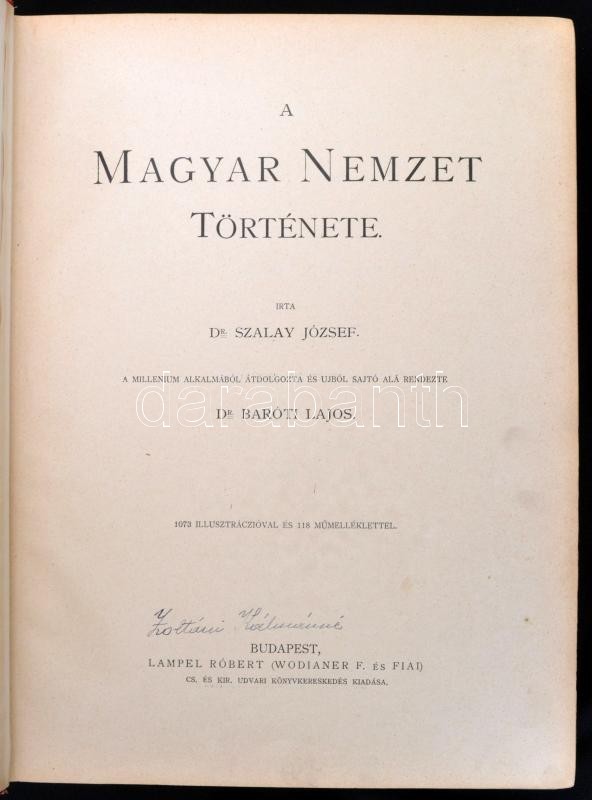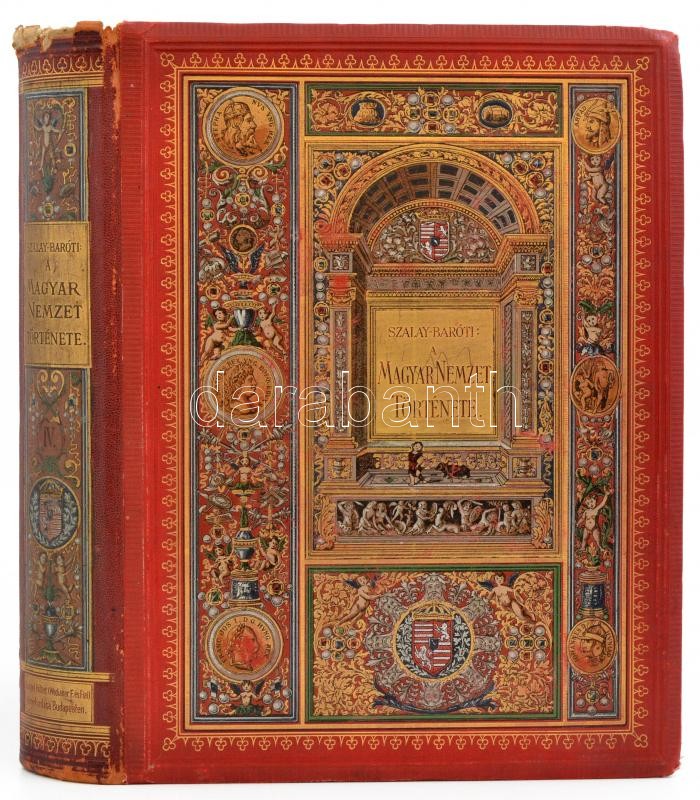Description: Szalay József-Baróti Lajos: A magyar nemzet története. IV. kötet: Magyarország a Habsburg-házból s a Habsburg-Lotharingiai házból származott örökös királyok korában. Bp., én., Lampel R. (Wodianer F. és Fiai.) Rendkívül gazdag képanyaggal. Kiadói aranyozott, festett, illusztrált félbőr-kötésben, a borítón és a gerincen kopásnyomokkal, a borító egy sarkán törésnyommal, a gerincen kis sérülésekkel.