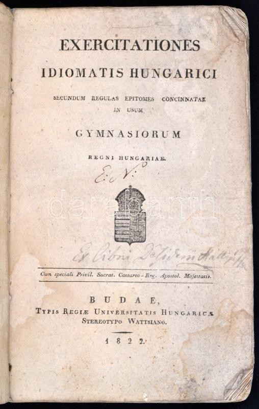 Description: [Verseghy Ferenc (1757-1822)]: Exercitationes idiomatis hungarici secundum regulas epitomes concinnatae in usum gymnasiorum Regni Hungariae. Budae, 1822, Typ. Regiae Universitatis Hungarica, 167 p. Magyar és latin nyelven. Kopott papírkötésben, foltos lapokkal, possessori bejegyzéssel.