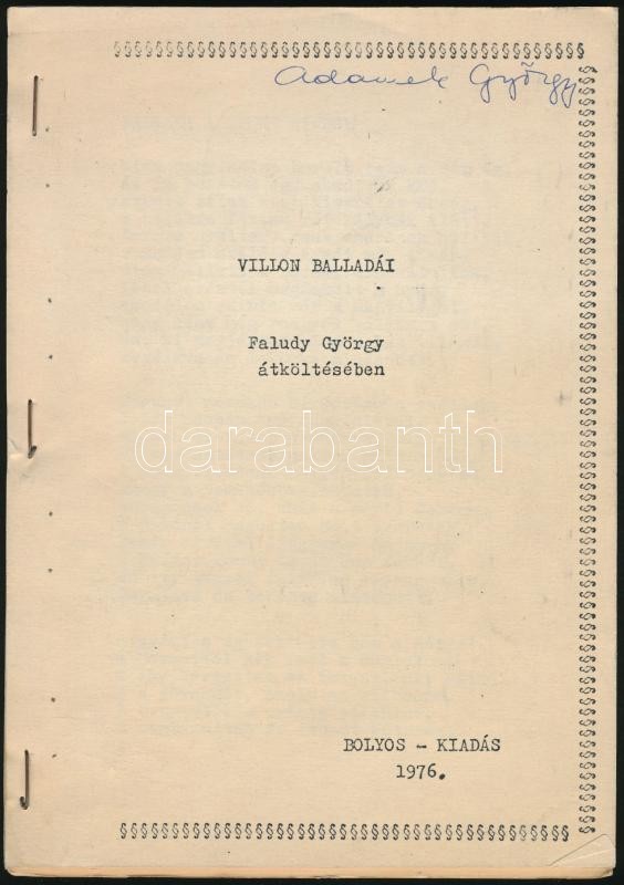 https://www.darabanth.com/en/367-Online-auction/367.0/Books/Books-Other-rarities~1500019/Villon-balladai-Faludy-Gyorgy-atkolteseben-hn-1976-Bolyos-64-p-Kiadoi-papirkotesbe~II2124271