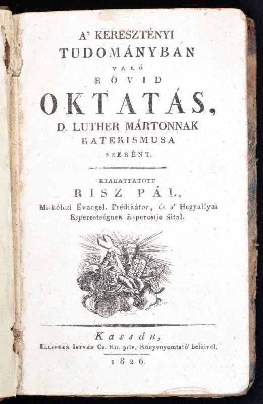 Description: Risz Pál: A keresztényi tudományban való rövid oktatás, D. Luther Mártonnak katekismusa szerint. Kassa, 1826., Ellinger István, 175 p. 2. kiadás. Korabeli kopott félbőr-kötésben, a gerincen kis sérülésekkel, dohos.
