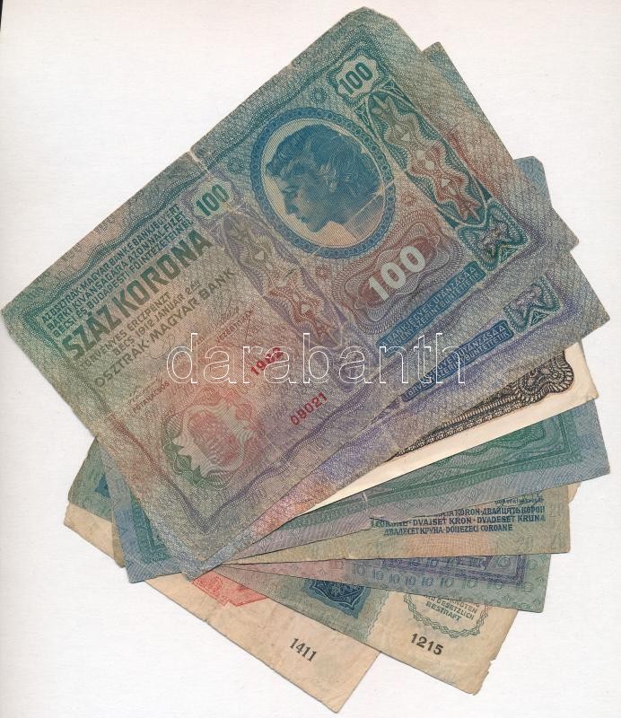 https://www.darabanth.com/en/367-Online-auction/367.0/Numismatics/Hungarian-Banknotes~2000007/1912-1920-8db-os-vegyes-magyar-korona-bankjegy-tetel-TIII-III-~II2128081