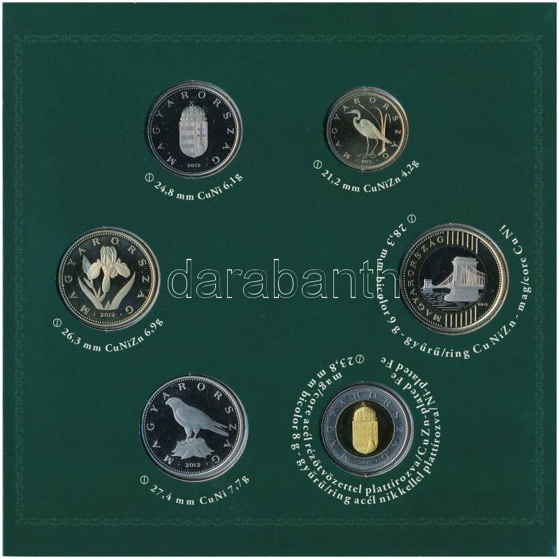 https://www.darabanth.com/en/367-Online-auction/367.0/Numismatics/Hungarian-coins-and-coins-with-Hungarian-mint-marks~2000008/2012-5Ft-200Ft-6xklf-forgalmi-sor-disztokban-Magyarorszag-korirattal-TPP~II2125657