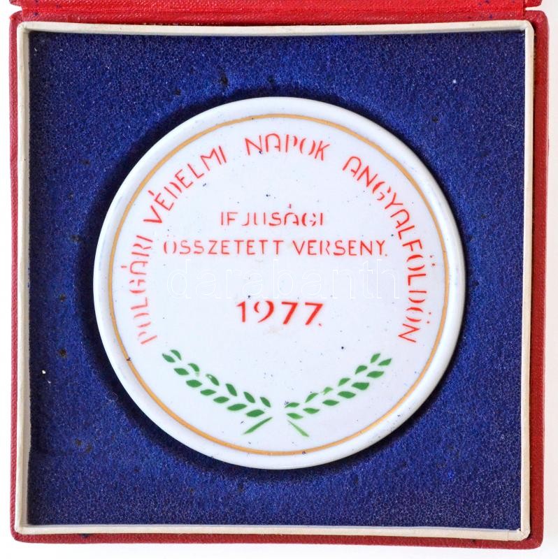 Description: 1977. "Polgári Védelmi Napok Angyalföldön - Ifjúsági Összetett Verseny 1977" festett, hátoldalán jelzett Hollóházi porcelán plakett, eredeti tokban (86mm) T:1-