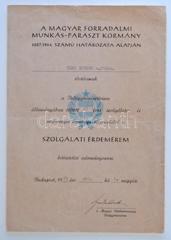 1957. "Szolgálati Érdemérem" zománcozott kitüntetés mellszalagon, miniatűrrel szalagsávon, tokban, adományozói okirattal T:2