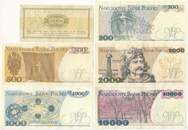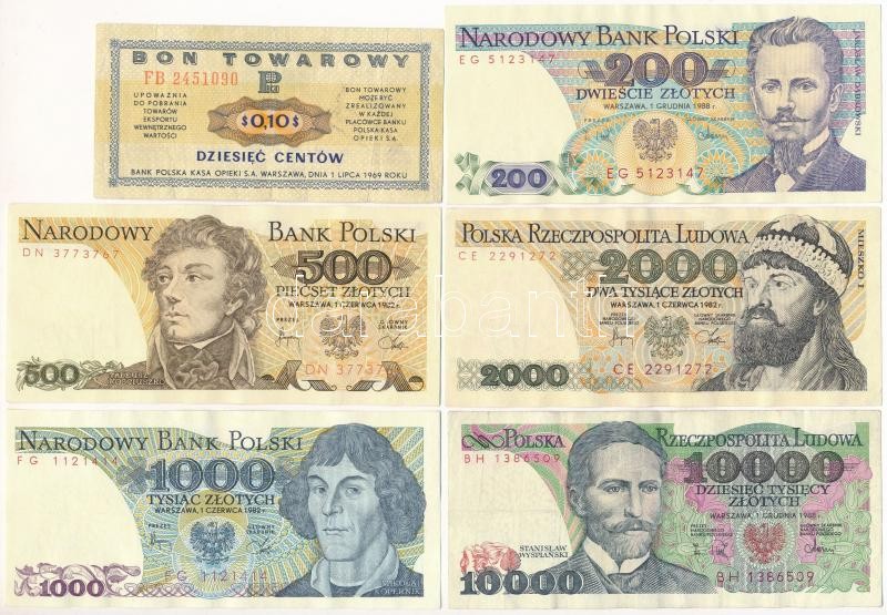 Lengyelország 1969. 0,10c "Bon Towarowy" + 1982. 500Zl + 1000Zl + 2000Zl + 1988. 200Zl + 10.000Zl T:II,III