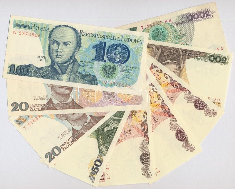 Lengyelország 1976-1986. 10Zl (1x), 20Zl (2x), 50Zl (1x), 100Zl (3x), 500Zl (1x), 5000Zl (1x), benne sorszámkövető 100Zl EF0295238 - EF0295239, T:I-II Poland 1976-1986. 10 Zloty (1x), 20 Zloty (2x), 50 Zloty (1x), 100 Zloty (3x), 500 Zloty (1x), 5000 Zloty (1x), sequential serials 100 Zloty EF0295238 - EF0295239, C:UNC-XF