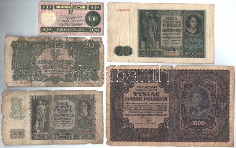 Lengyelország / Német megszállás 1940. 20Zl + 1941. 50Zl + Lengyelország / Lengyel Nemzeti Felszabadítási Bizottság 1944. 20Zl + Lengyelország 1919. 100M + Lengyelország 1979. 0,10$ utazási csekk T:III-,IV