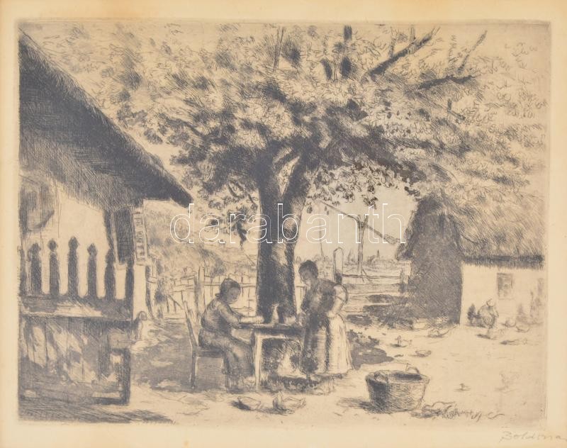 Boldizsár István (1897-1984): Kertfa alatt. Rézkarc, papír, jelzett, ü...
