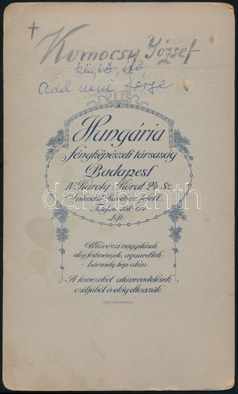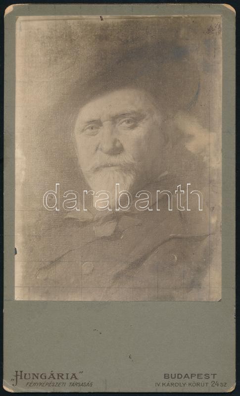 Description: cca 1890 Komócsy József (1836-1894) költő, író, a Petőfi Társaság alelnökének portréja, Benczúr Gyula festménye nyomán készült keményhátú fotó, 22×13 cm