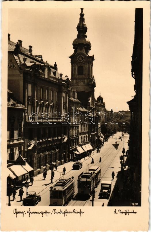 1934 Graz, Gasse, Kirche / street view, church, trams. L. Strohschneid...