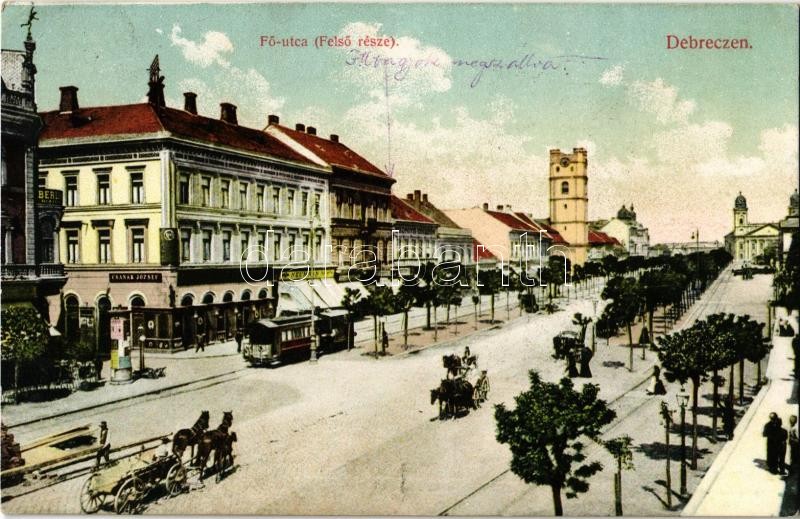 Description: 1910 Debrecen, Fő utca felső része, villamos, Központi szálloda, Neumann M. és Csanak József üzlete, Berlin biztosító, lovaskocsi. Antalfy József kiadása