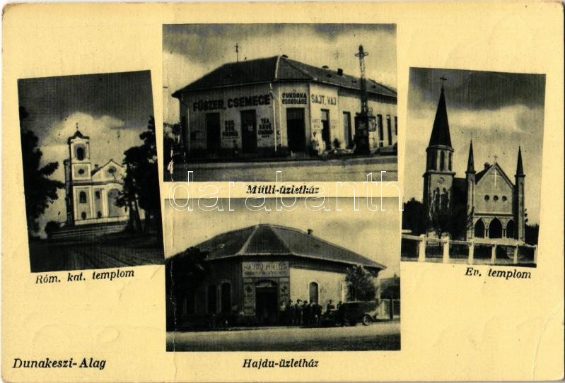 Dunakeszi-Alag, Római katolikus templom, Evangélikus templom, Mittli üzletház, Hajdu Miklós üzlete, automobil (fa)