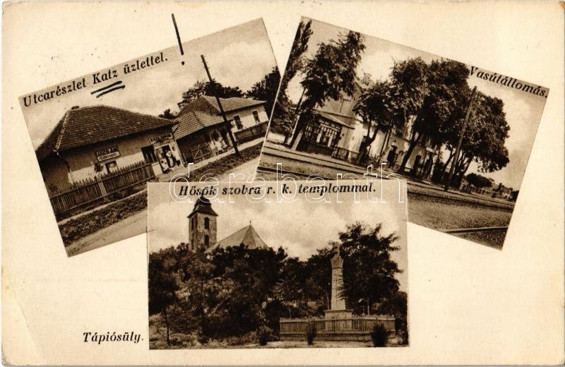 Tápiósüly (Sülysáp), vasútállomás, Hősök szobra, római katolikus templom, utca, Lakatos János és Katz Árpád üzlete (EK)