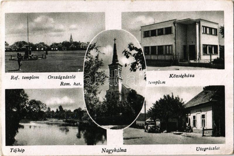 Description: 1943 Nagykálna, Kalná; utca, községháza, Római katolikus és református templom, Országzászló / churches, street, town hall, Hungarian flag + "M. Kir. Mozgóposta 110" (EK)