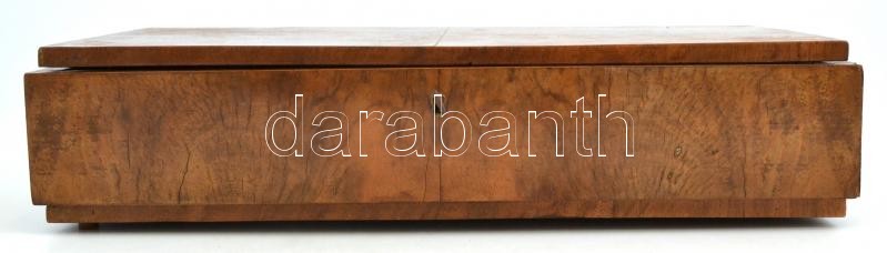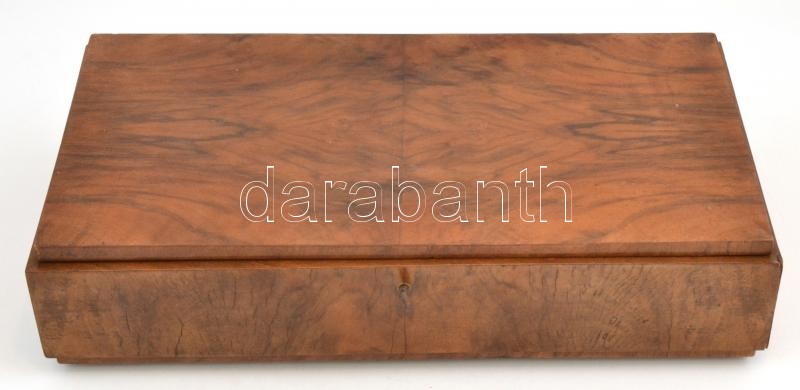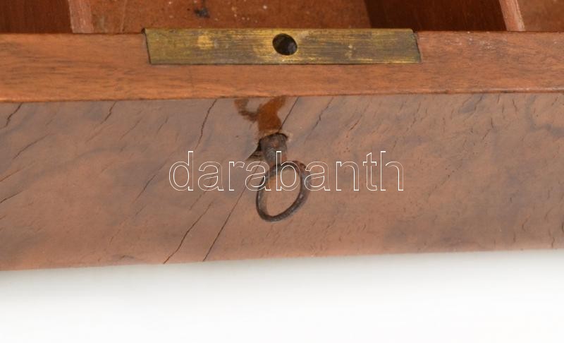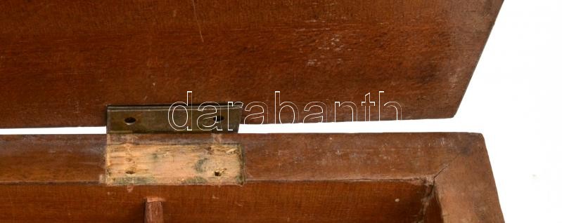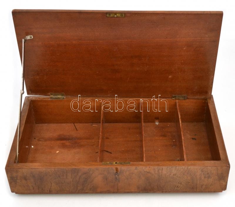 Régi rekeszes fadoboz, az egyik zsanér részben elengedett, az egyik kis láb hiányzik, a kulcs megvan, de a zár nem működik, 40x21x8 cm