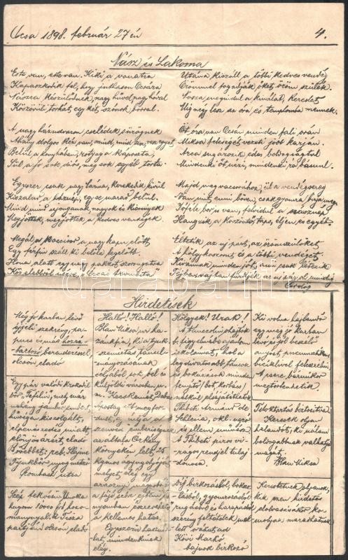 1898 "Ócsai Trombita" I. évfolyam első és utolsó száma, kézzel rajzolt és írt, stencilezett humoros diákkiadvány, hajtva, 4p