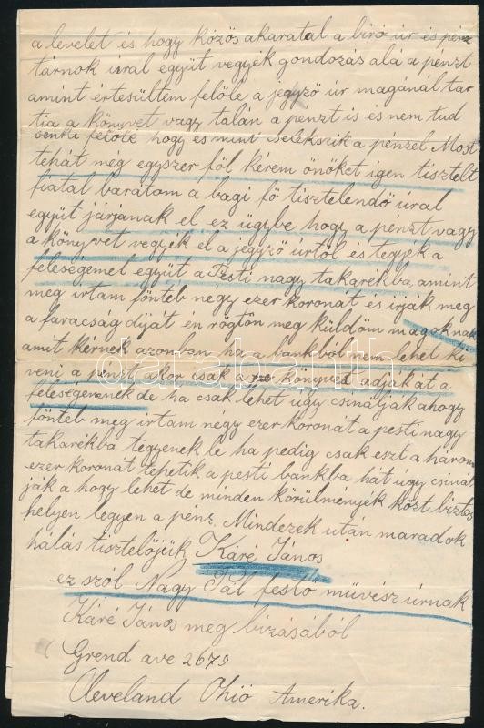 1913 Clevelandbe kivándorolt magyar állampolgár levele ha a hajó levél...