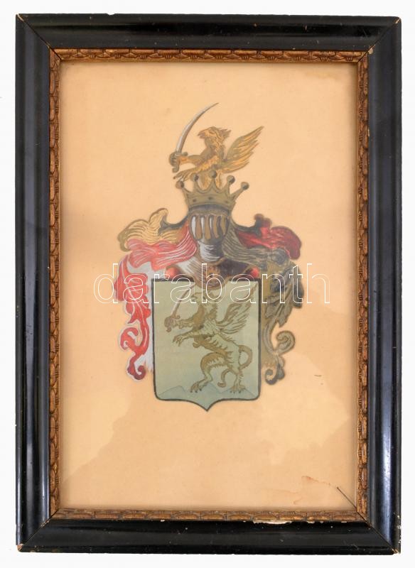Description: cca 1920-40 A Lisznyai Szabó család Erdély fejedelme által adományozott főnemesi festett címere. Akvarell, papírra kasírozva. Lap alja enyhén foltos, rajz ép. Üvegezett, enyhén sérült régi fa keretben, hátoldalán feliratozott, 19x12 cm. Heraldikai érdekesség és ritkaság, egyedi darab!