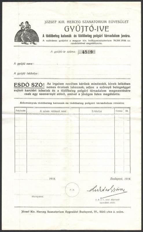 1918 József szanatórium gyűjtőív a tüdőbeteg katonák számra