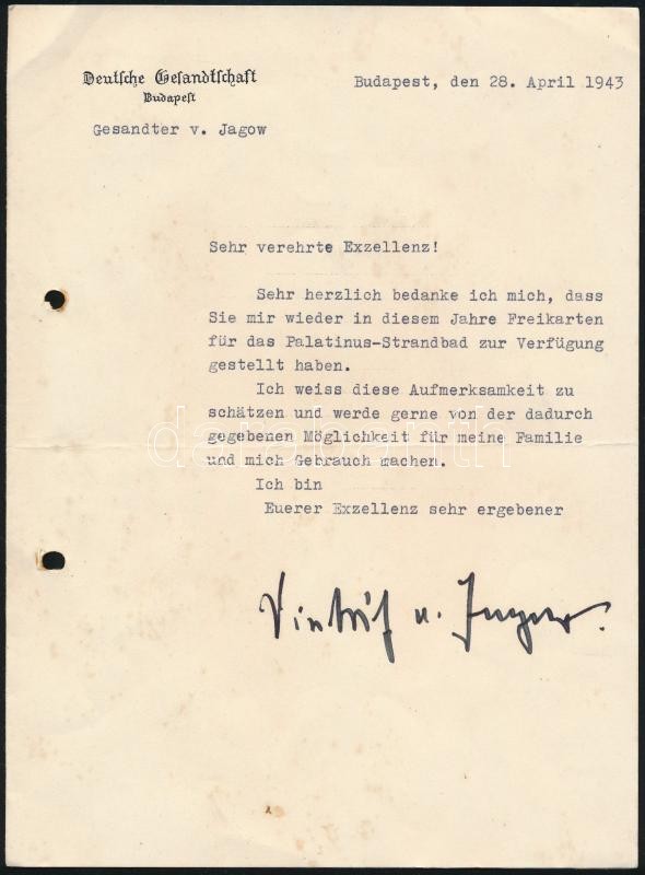Description: 1943 Dietrich von Jagow (1892-1945) magyarországi náci német követ saját kézzel aláírt levele, melyben megköszöni a Palatinus strandra kapott ingyen-belépőt, 1943. április 28.