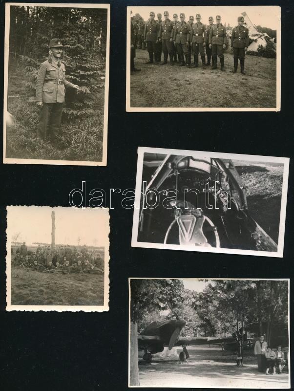 cca 1936-44 5 db fotó NSDAP-val kapcsolatos és német katonai fotó a harmadik birodalom idejéből: 1 db 1936 csoportkép horogkeresztes karszalagot viselő egyenruhás férfiakról, hátoldalán "Gauparteitag 1936 Lüneburg" (regionális pártkongresszus Lüneburg) felirattal, hátoldalán pecséttel jelzett , 6,5x8,7 cm. 2 db a Luftwaffe repülőgépeiről, az egyik a belsejét mutatja a műszerfallal, 5,7x8,6 és 6,3x9,1 cm. 2 db egyenruhásokról, portré férfiról és csoportkép fegyveres katonákról, tisztekkel, 9,7x6 és 6x5,8 cm/ 5 photos related to NSDAP and german military, 1 pc gropu portrait of men in uniform with "Gauparteitag 1936 Lüneburg" written on the back. 2 pcs with Luftwaffe planes. 1 pc portrait of man in uniform. 1 pc group portrait of soldiers with arms.