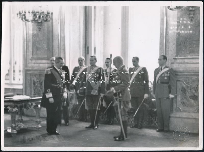 Description: cca 1944 Horthy Miklós (1868-1957) kormányzó, és Oszlányi Kornél (1893-1960) vezérőrnagy, a katonai Mária Terézia-rend átadásának ceremóniáján fogadja József főherceget (1872-1962), fotó, M. Kir. Honvéd Haditudosító Osztály szárazpecséttel, 18x24 cm