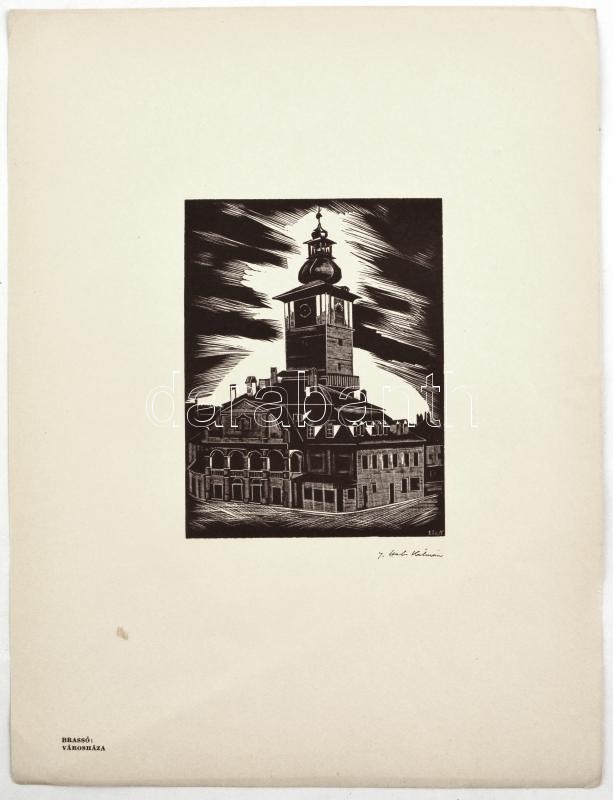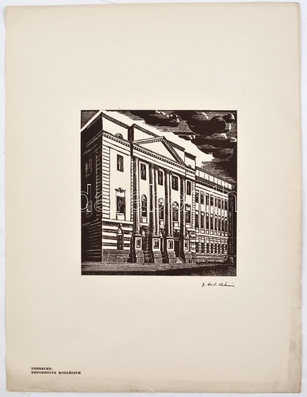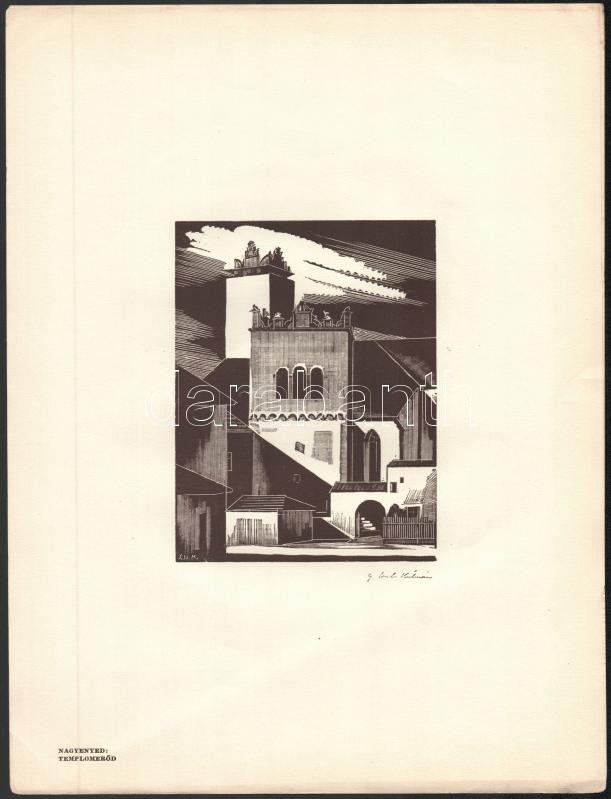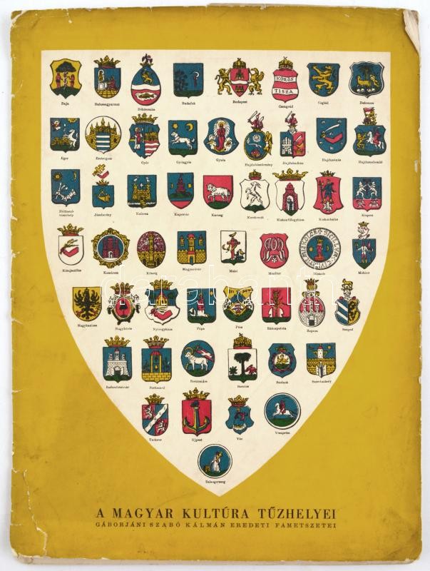 Gáborjáni Szabó Kálmán A magyar kultúra tűzhelyei. 14 fametszet. Teljes! [Budapest, 1935]. Magyar Kulturális Egyesületek Szövetsége. Budapest, Szeged, Debrecen, Esztergom, Sopron, Miskolc, Zsámbék, Eger, Nagyenyed, Késmárk, Brassó, Kassa, Kolozsvár és Pozsony. Magyar városok címereivel illusztrált, kissé szakadozott színes kiadói papírmappában.